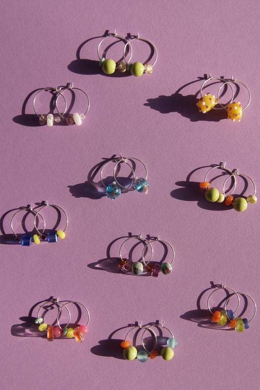 Handmade beaded earrings, created with a variety of second-hand, vintage, new, and found beads. All of my pieces are one of a kind or small batch and meant to bring the wearer a sense of joy, nostalgia, and playfulness.
