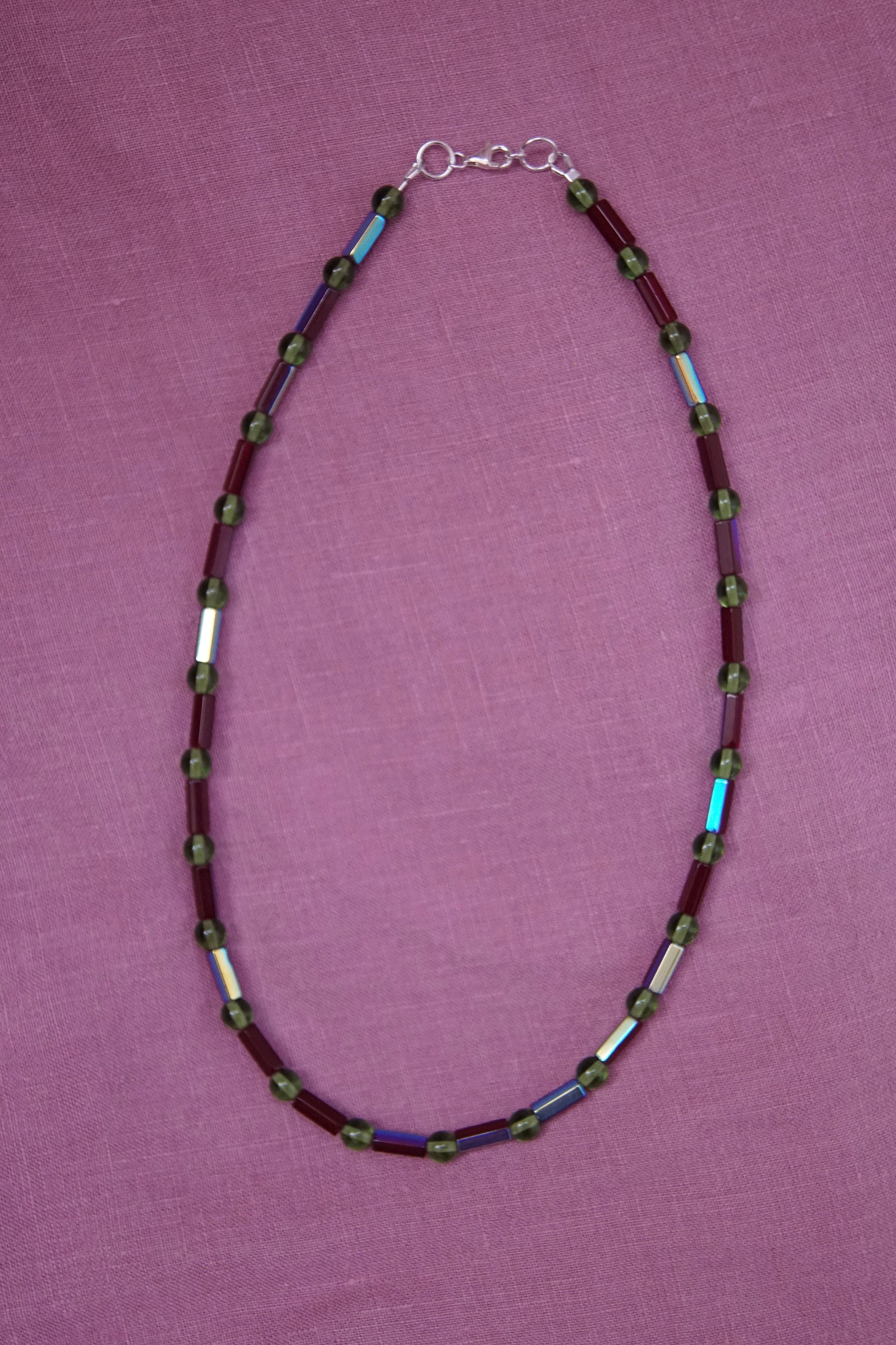 Made with vintage iridescent cranberry red barrel beads and glass green beads. Approximately 18” long with a sterling silver clasp.