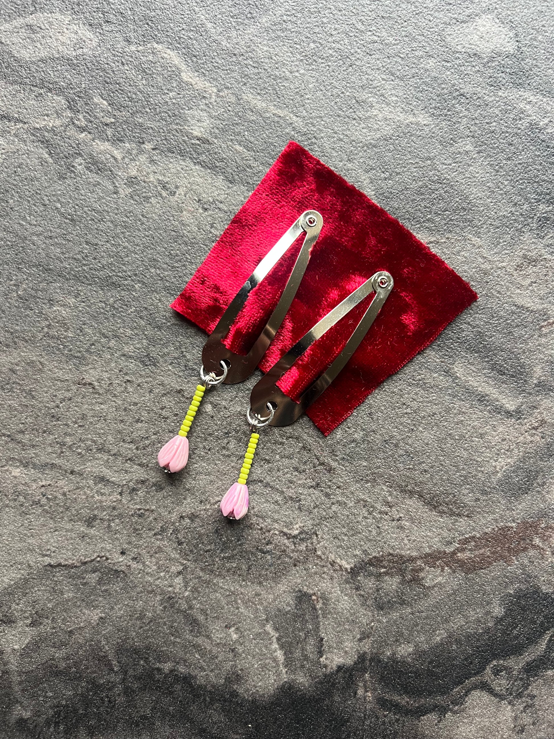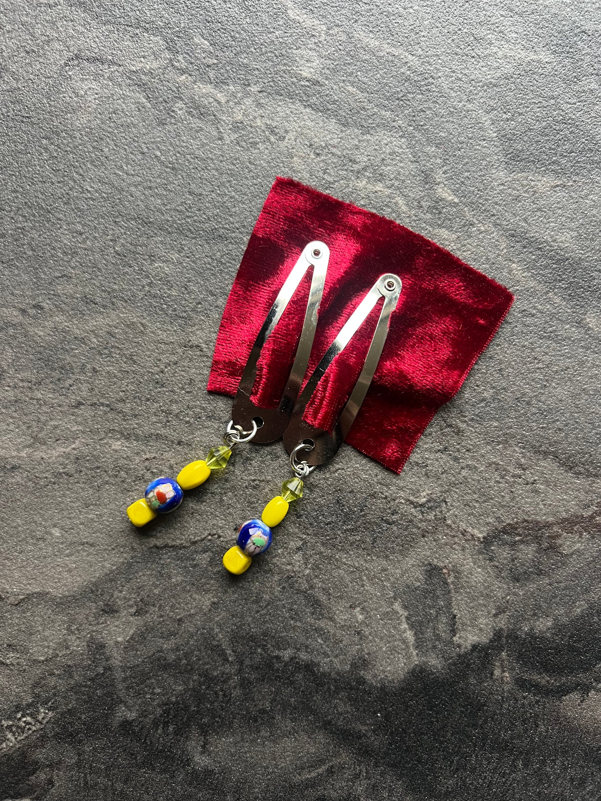 Each hair clip duo is made with second hand, vintage, and new beads.