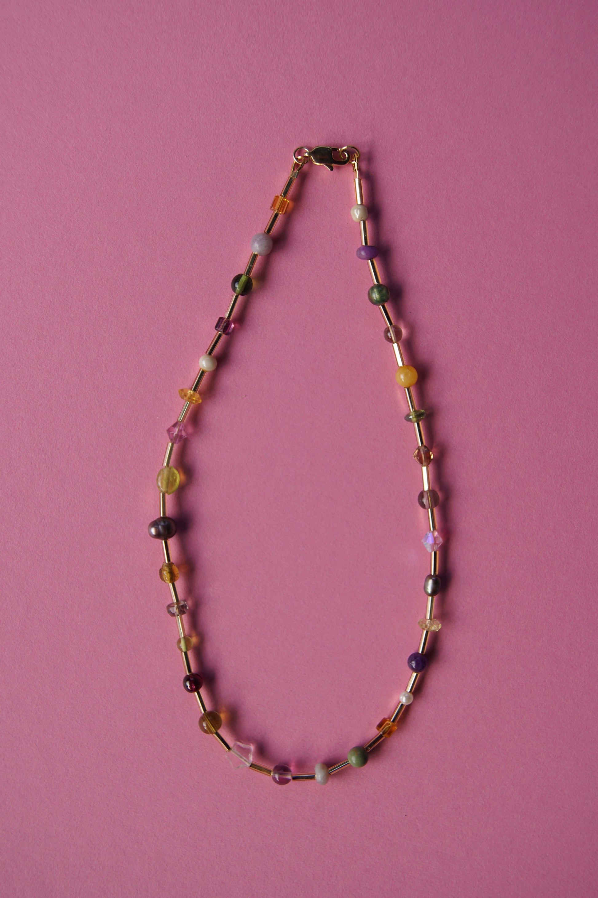 Party Down Mini necklaces are made with glass bugle beads, and various, small beads from vintage hauls, new strands, and inherited beads from friends and family. Each strand is completely unique and while they may look alike, there are no two the same.