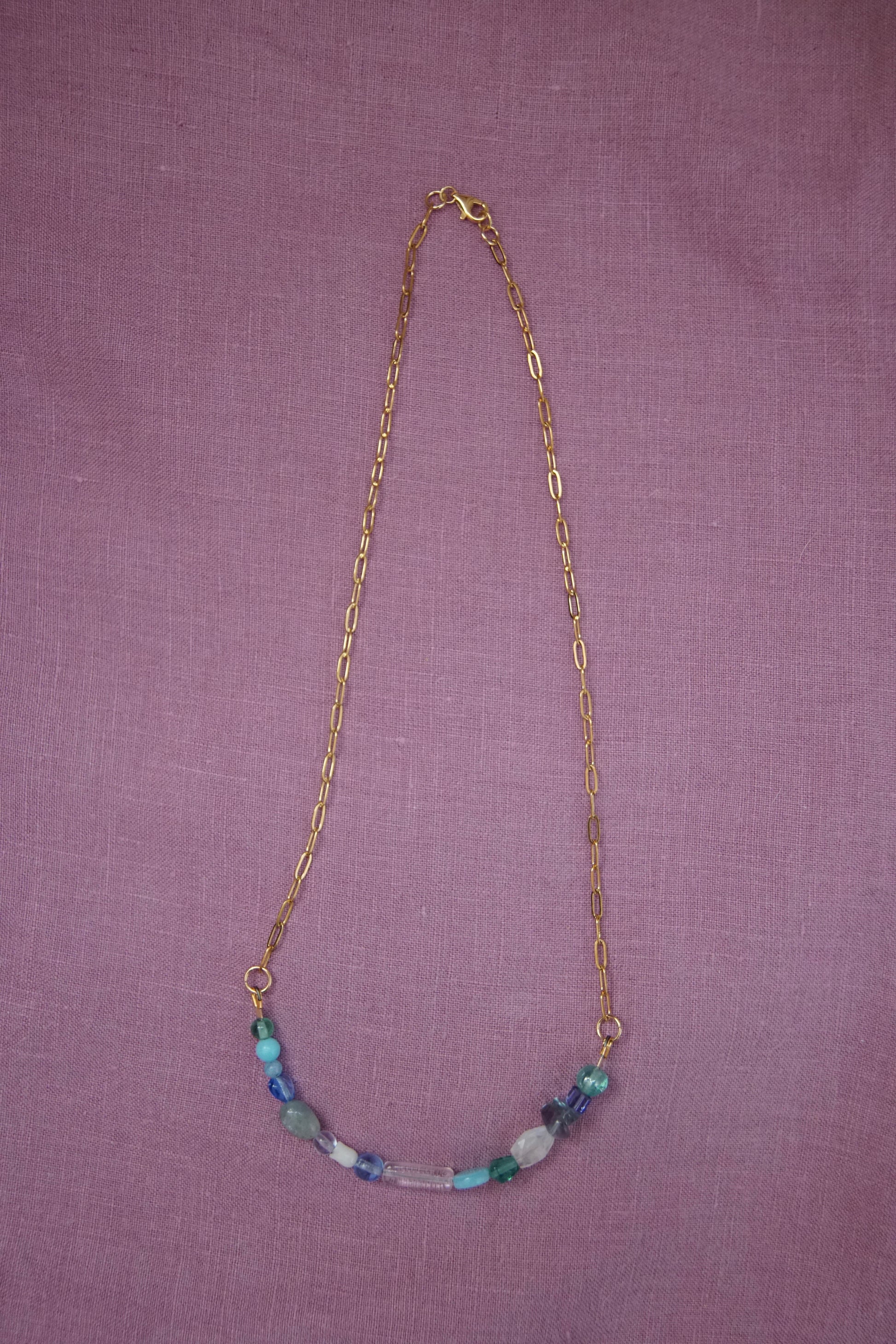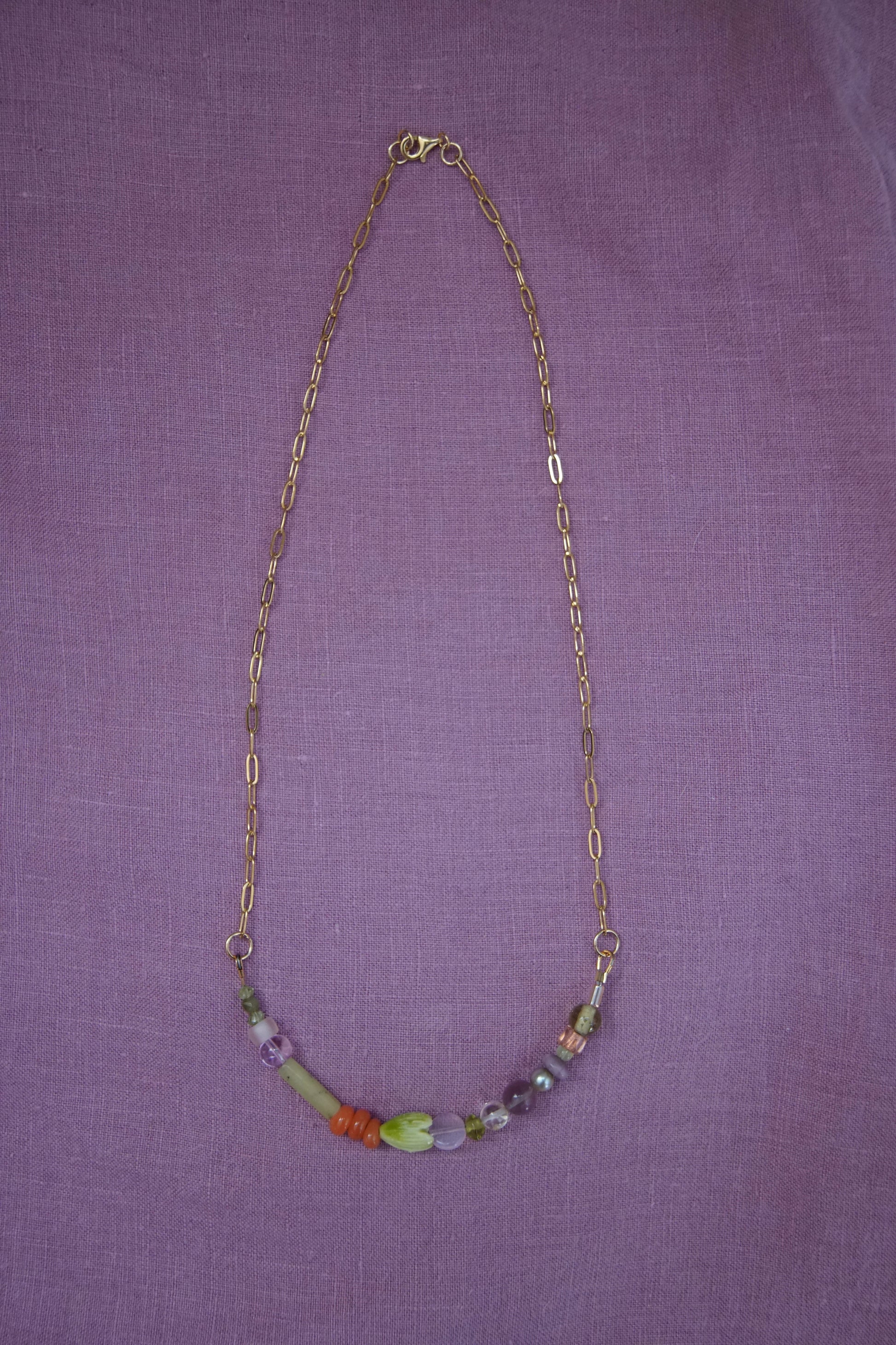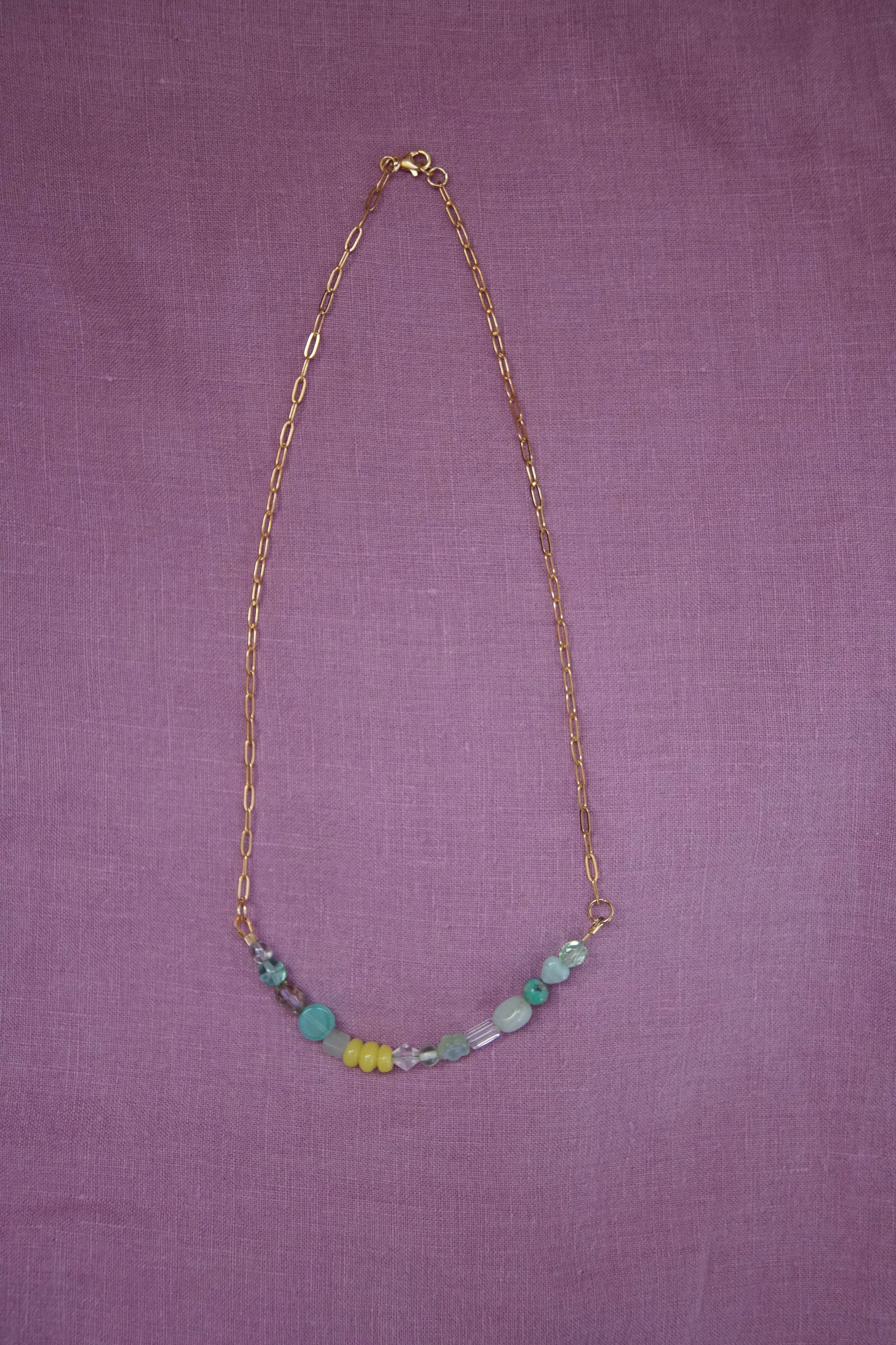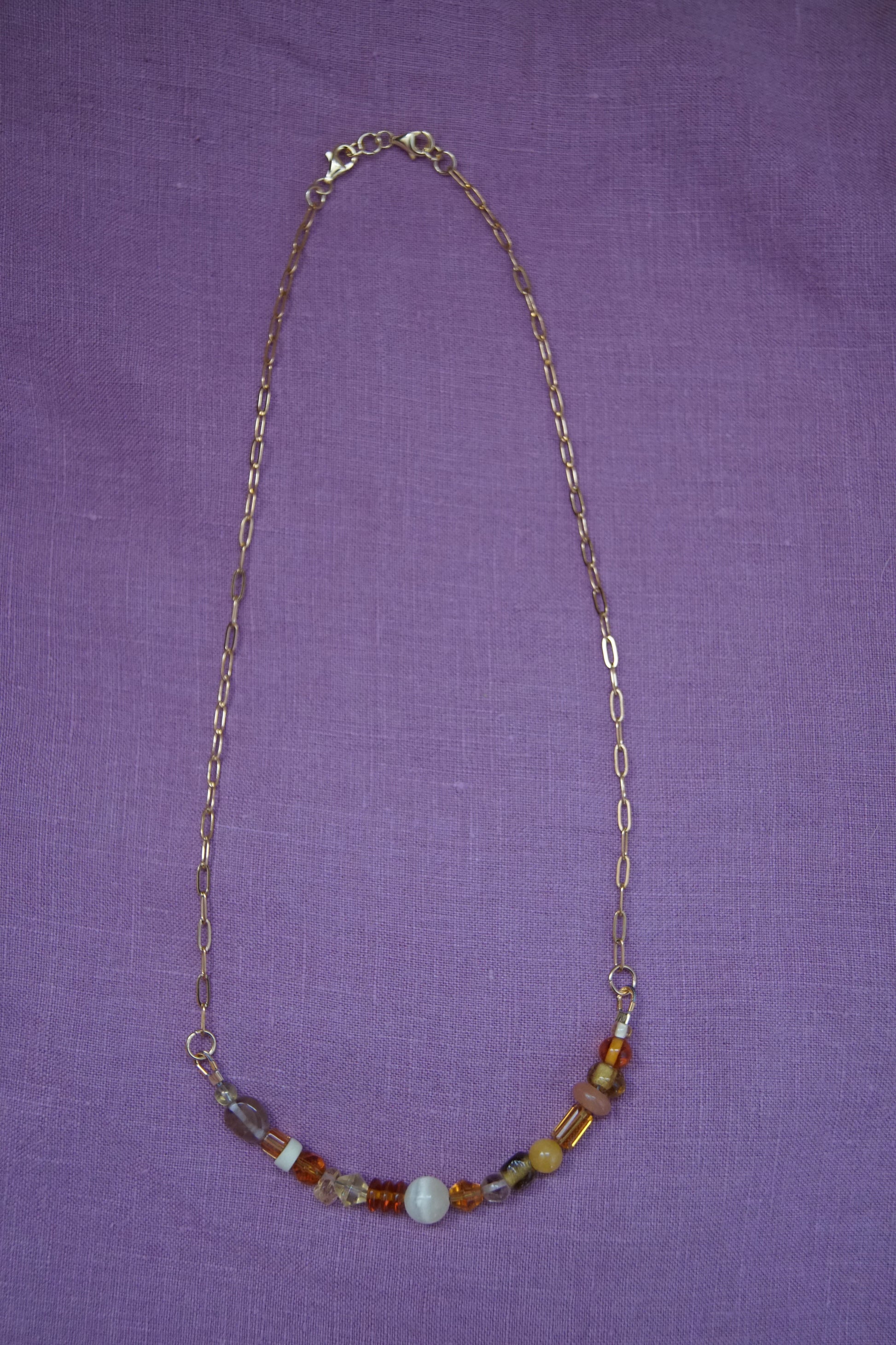 Sun Drop necklaces have a variety of vintage, second-hand, and new glass and gemstone beads. They are approx 18.5” long with a paperclip chain and gold plated sterling silver clasp.