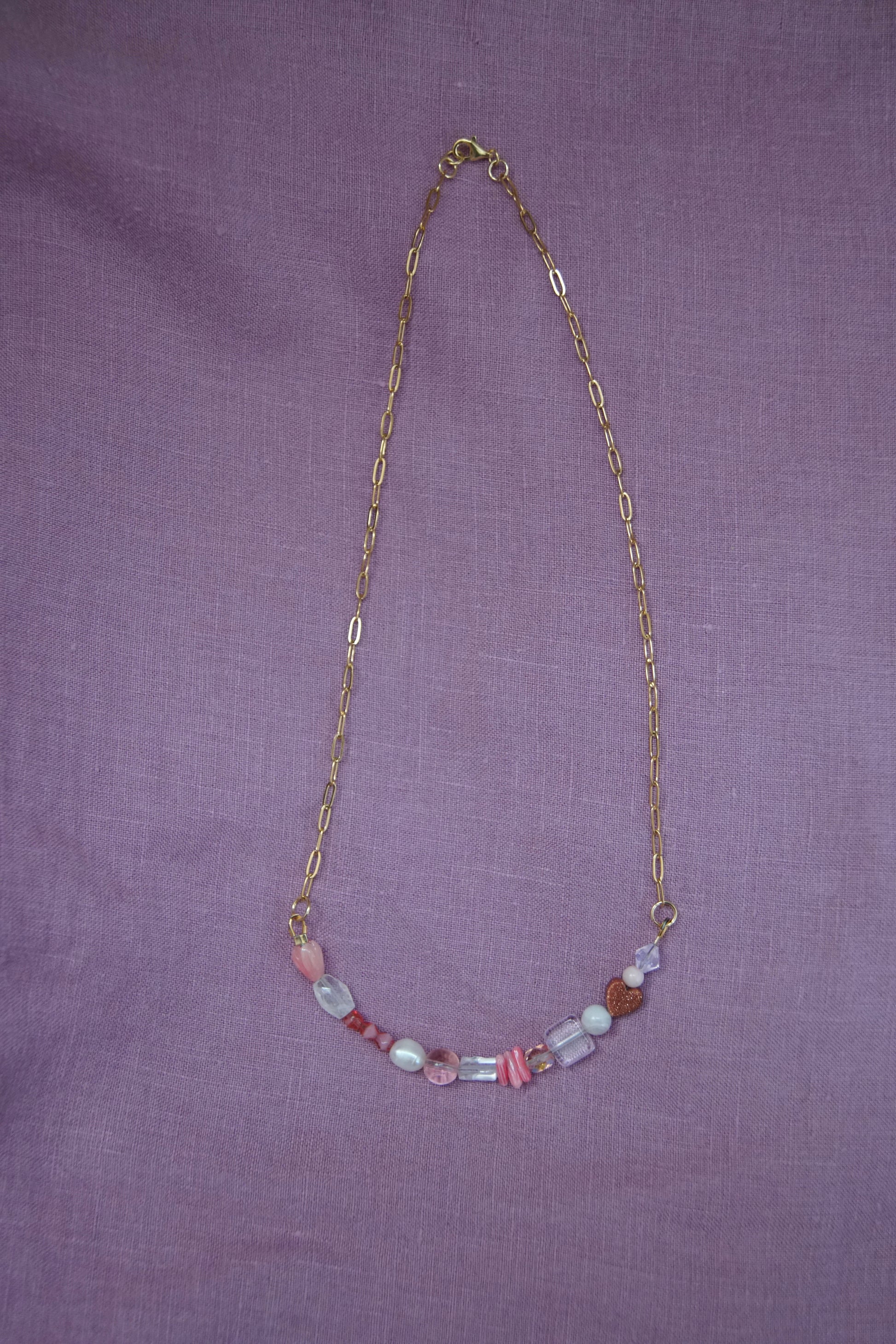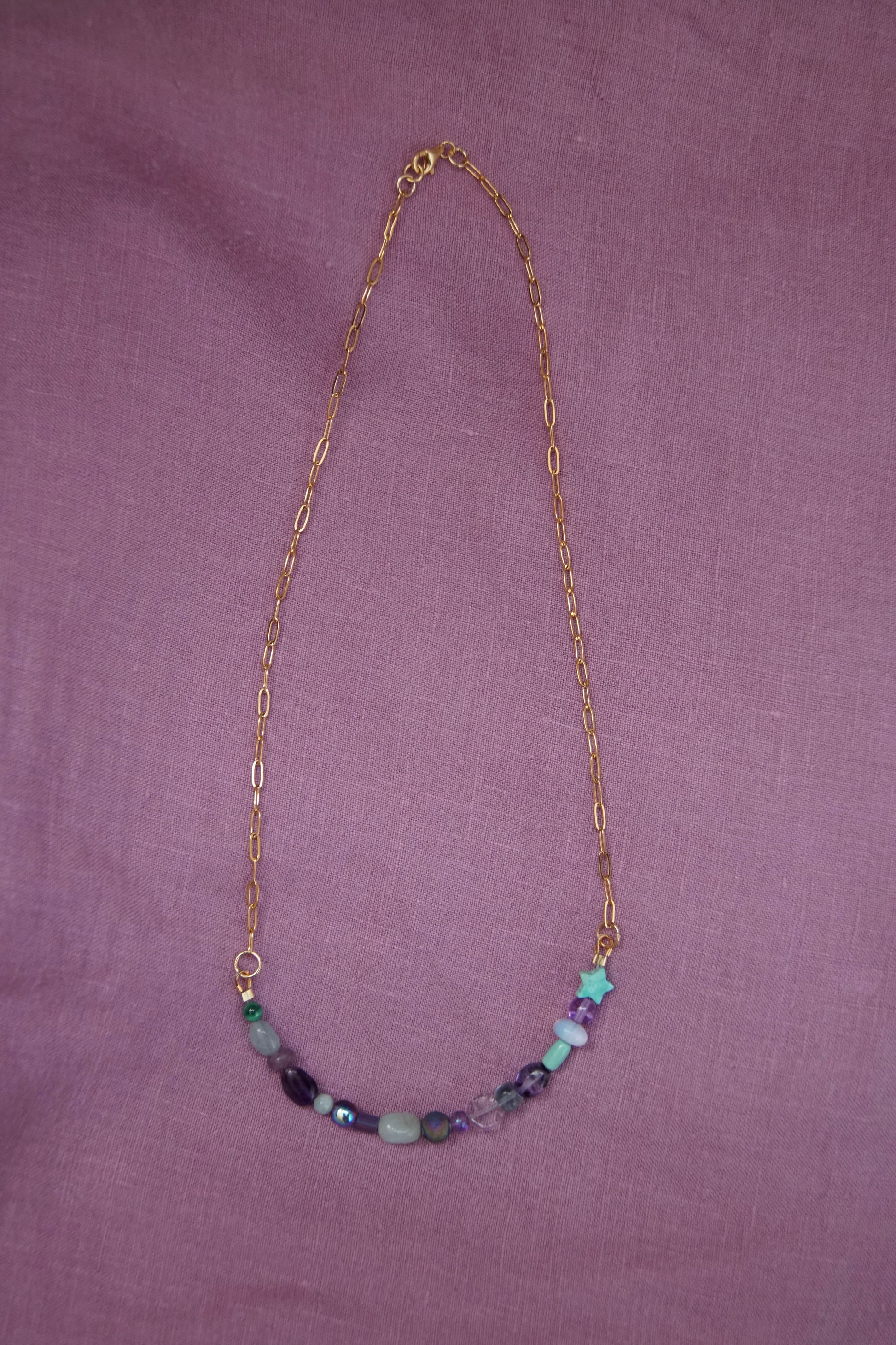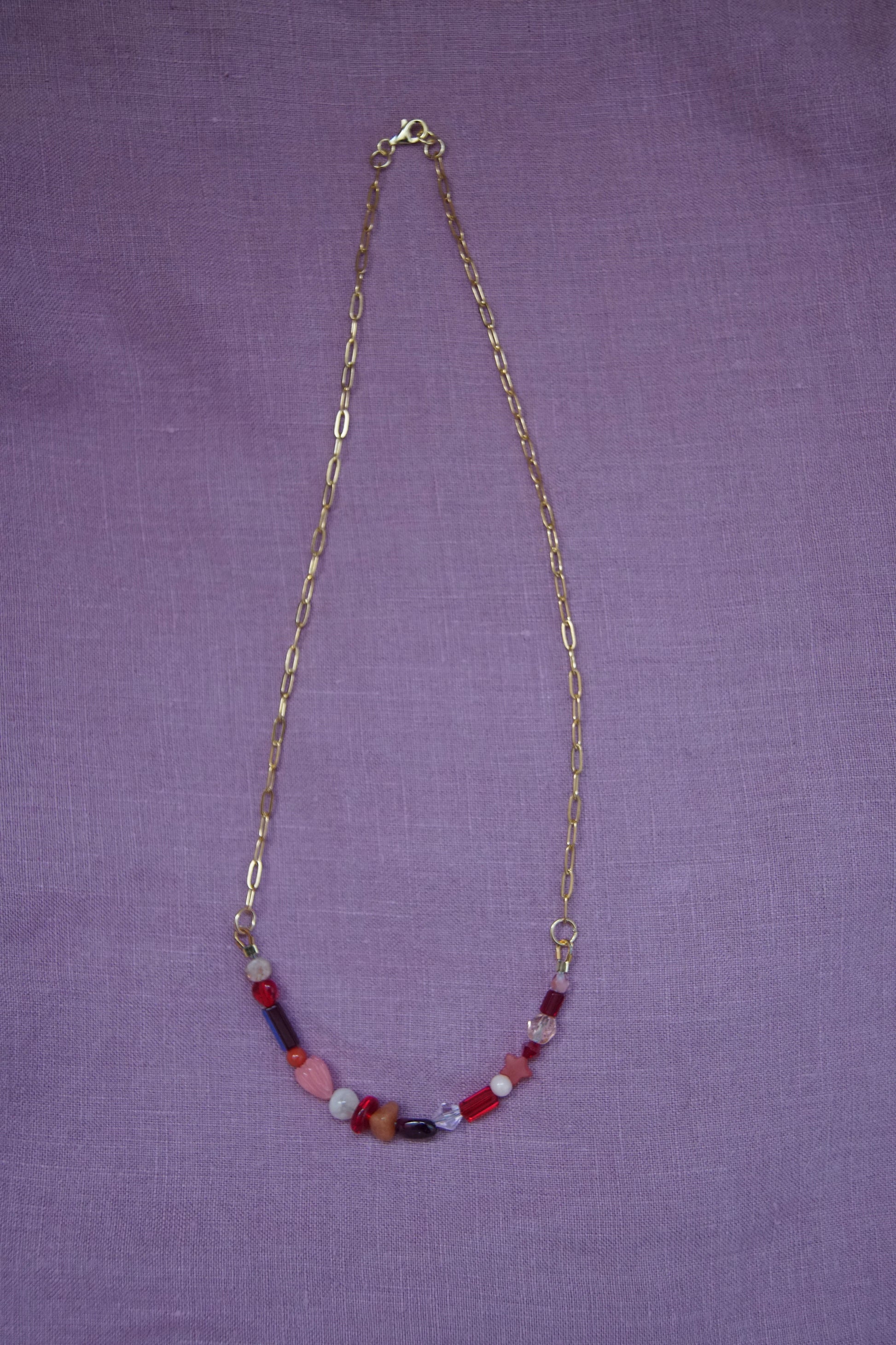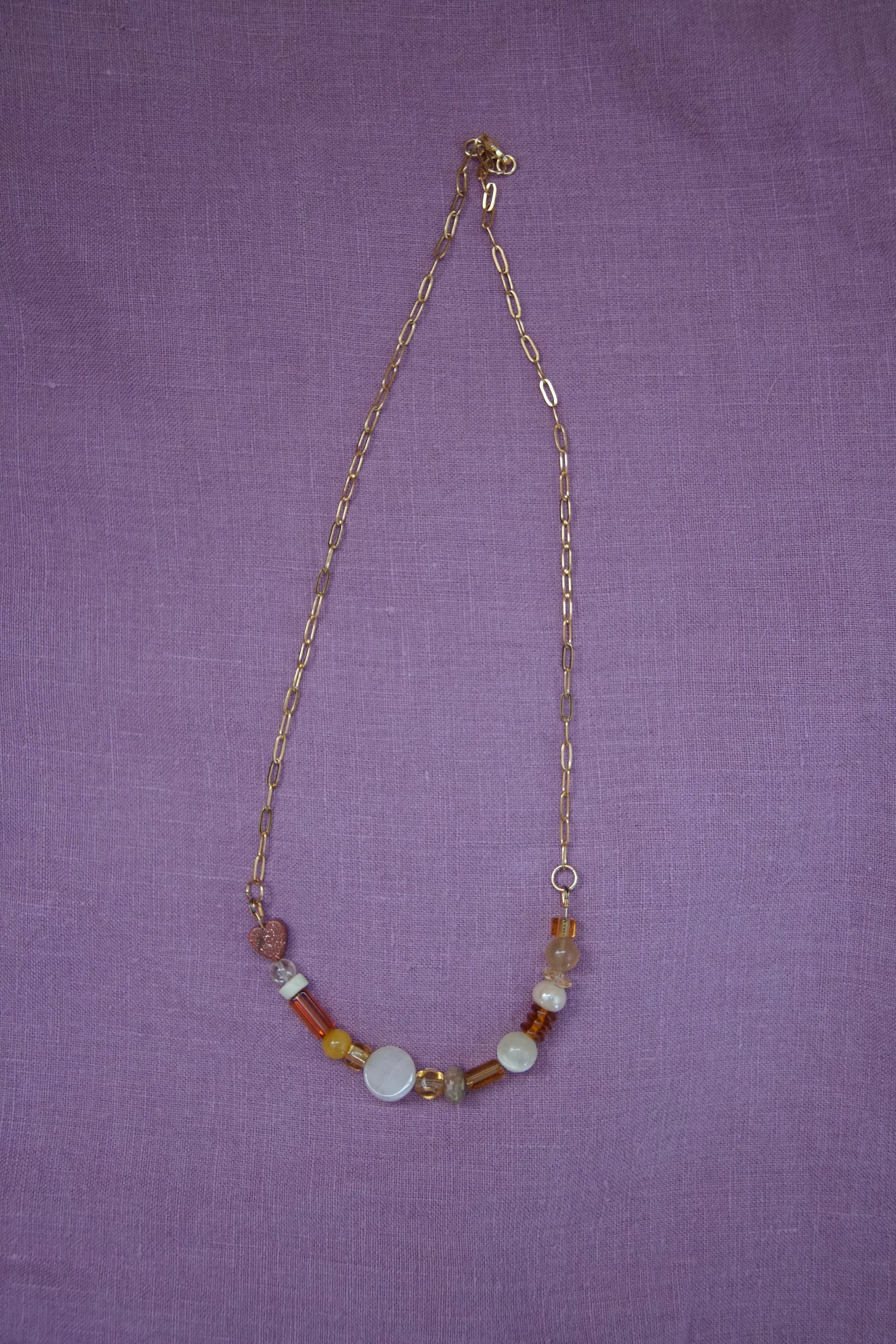 Sun Drop necklaces have a variety of vintage, second-hand, and new glass and gemstone beads. They are approx 18.5” long with a paperclip chain and gold plated sterling silver clasp.